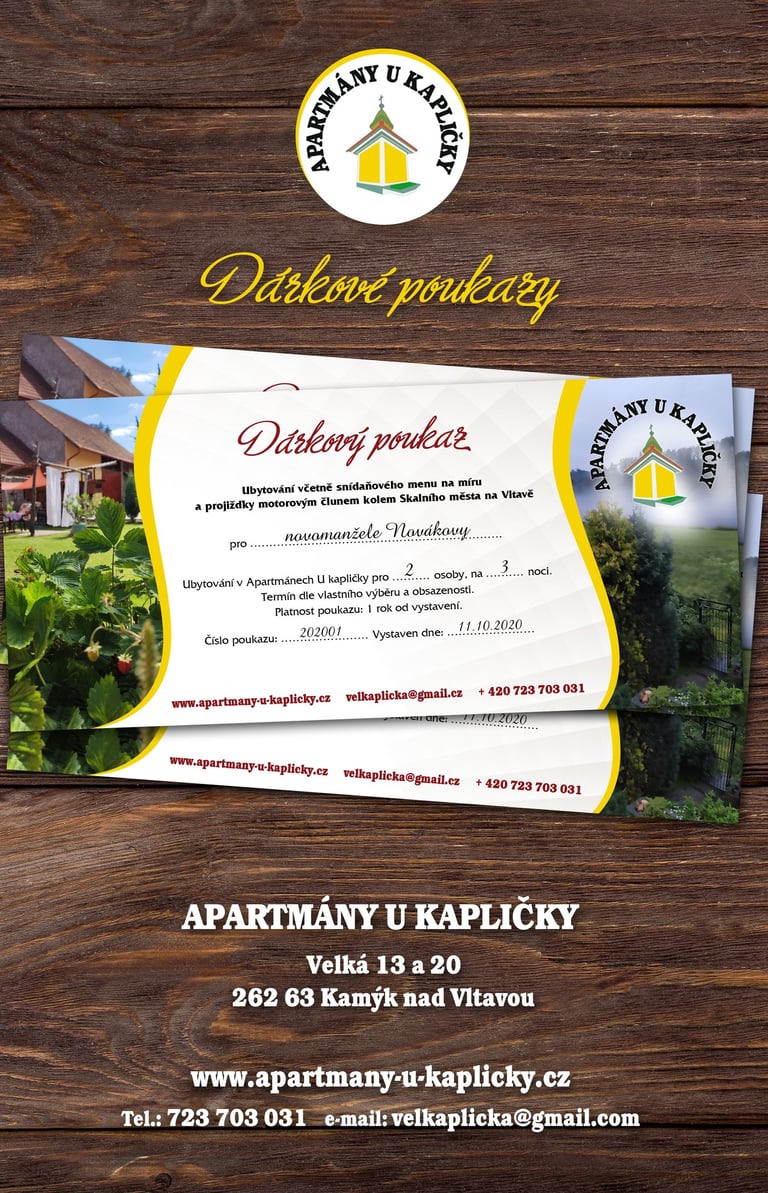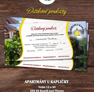 Připravili jsme pro vás možnost darovat pobyt v Apartmánech U Kapličky prostřednictvím dárkového poukazu. Dárkový poukaz našeho penzionu je vhodný, pokud chcete darovat dovolenou nebo příjemně strávený prodloužený víkend.